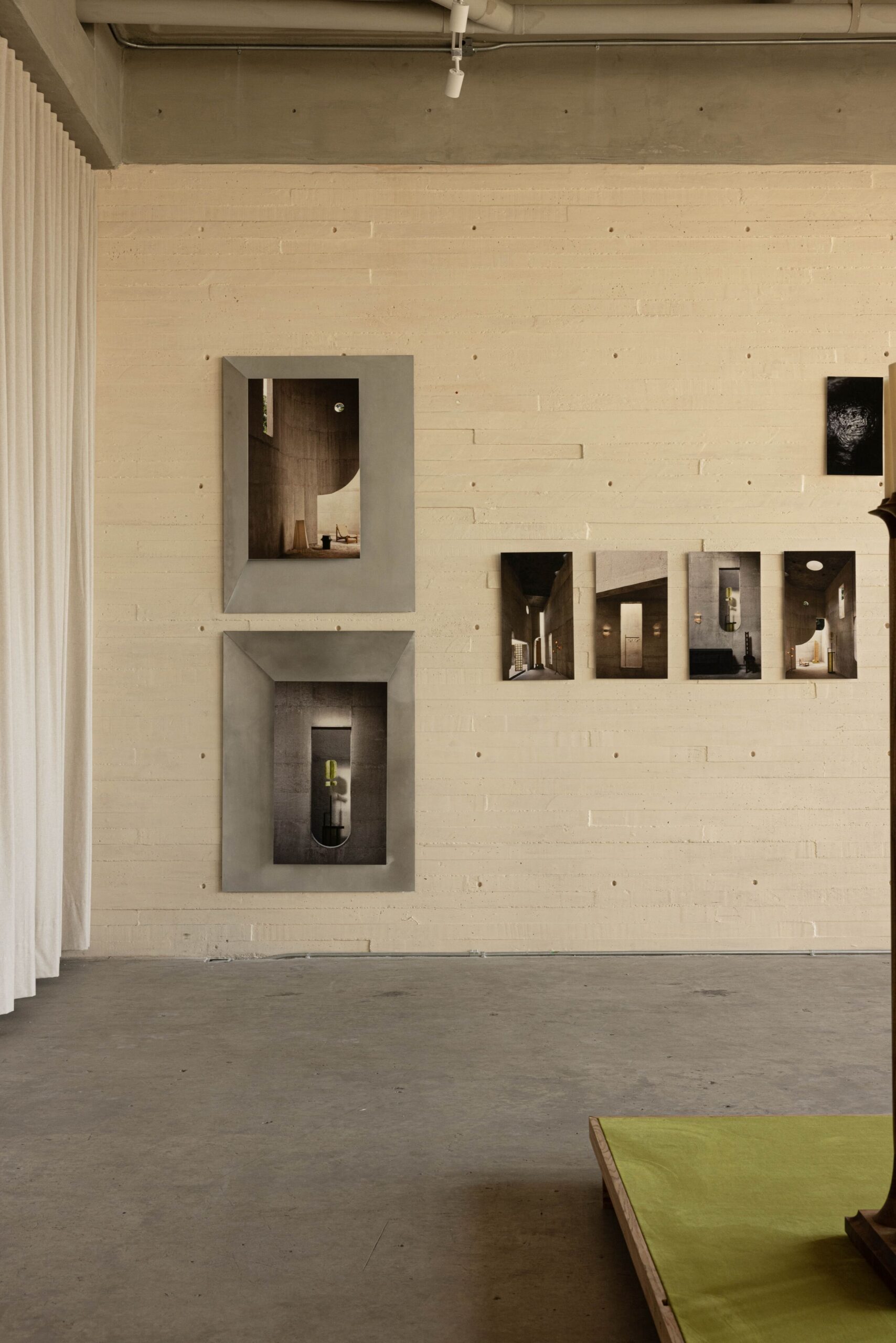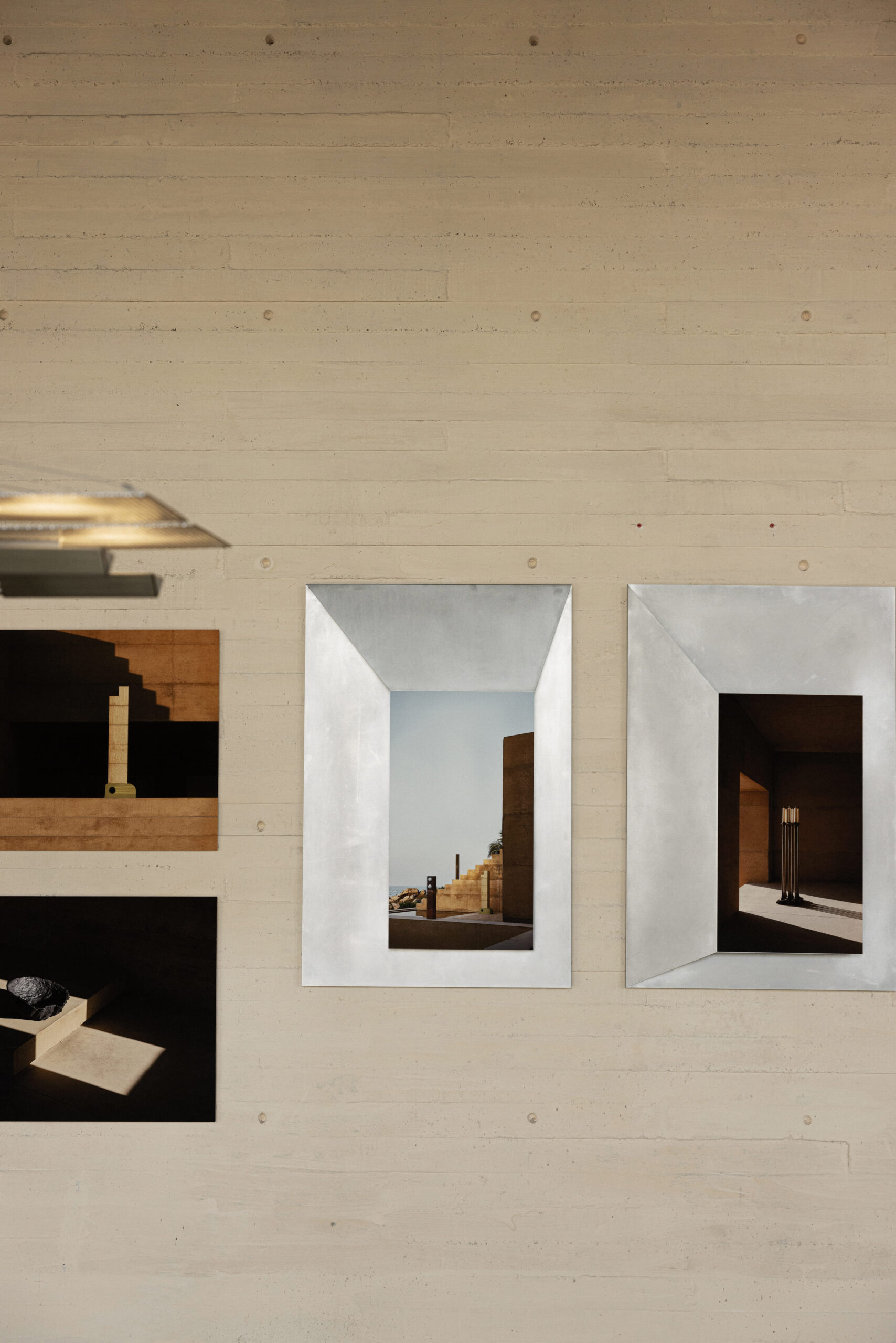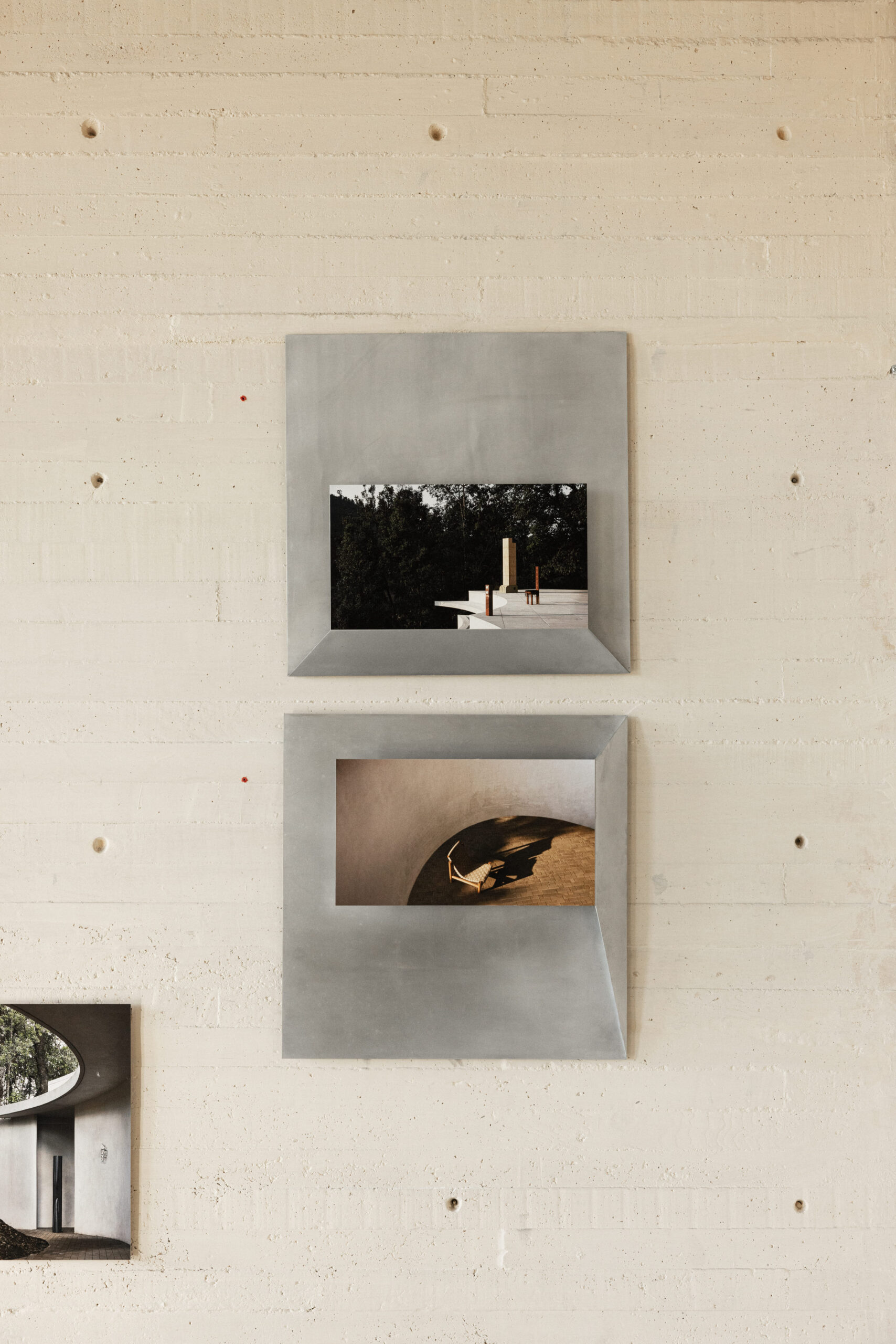 THE PHOTOGRAPHS ARE PRESENTED IN CUSTOM FRAMES DEVELOPED AS A COLLABORATION BETWEEN ALEJANDRO RAMÍREZ OROZCO AND MANU BAÑÓ, AND DESIGNED BY MANU BAÑÓ. MADE FROM FOLDED ALUMINUM SHEET, THESE FRAMES FORM A SPECIAL DESIGN CREATED SPECIFICALLY FOR THE EXHIBITION AND ENGAGE IN DIALOGUE WITH THE FOURTEEN PHYSICAL PIECES PLACED AT THE CENTER OF THE SPACE ON A PLATFORM.