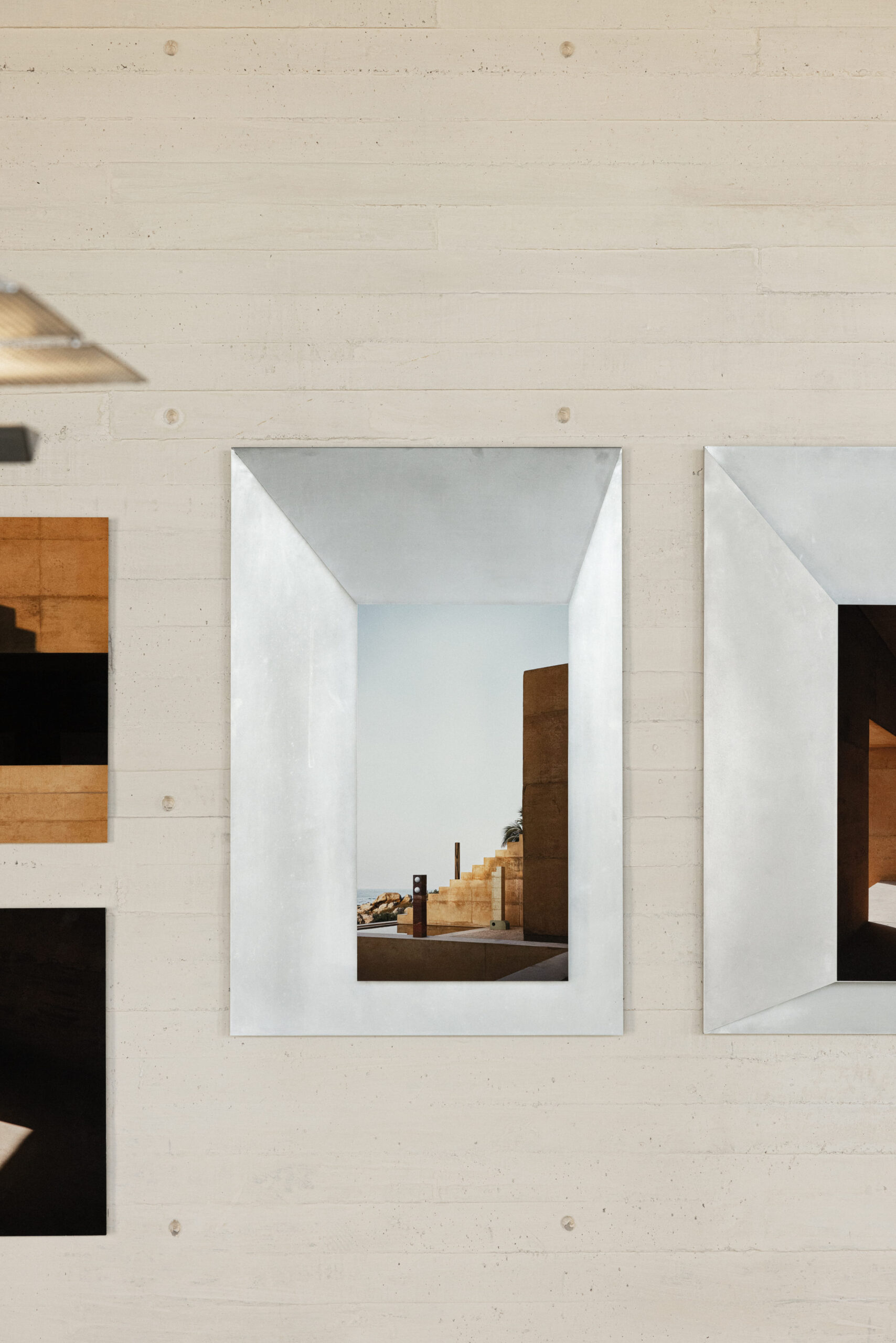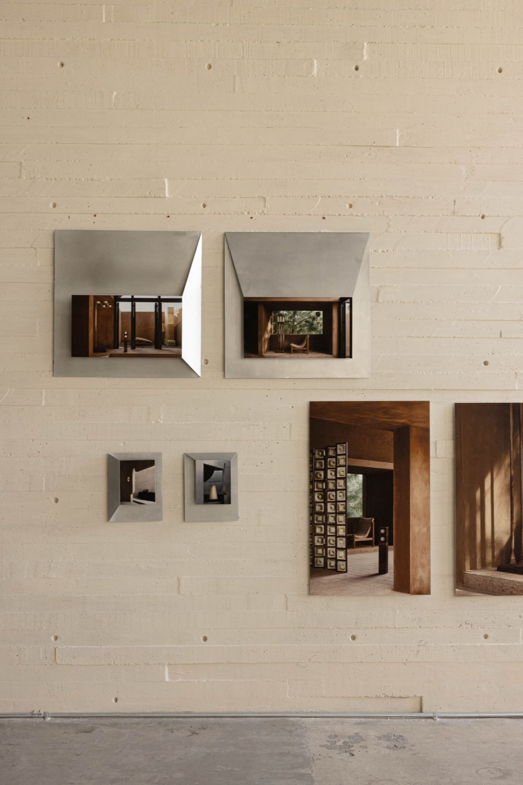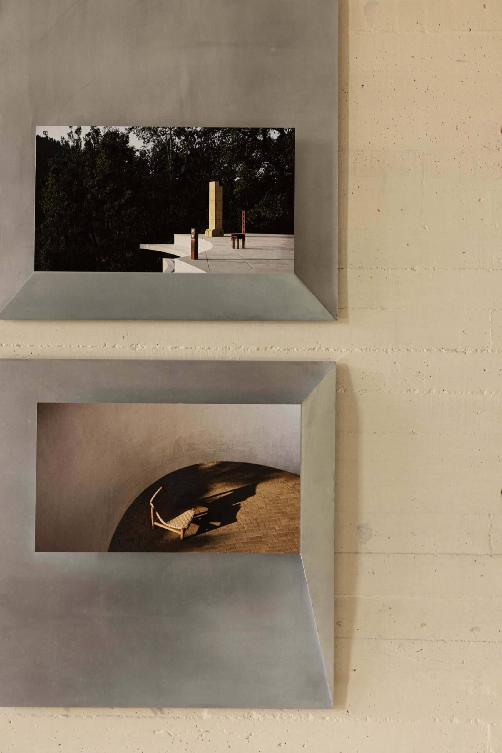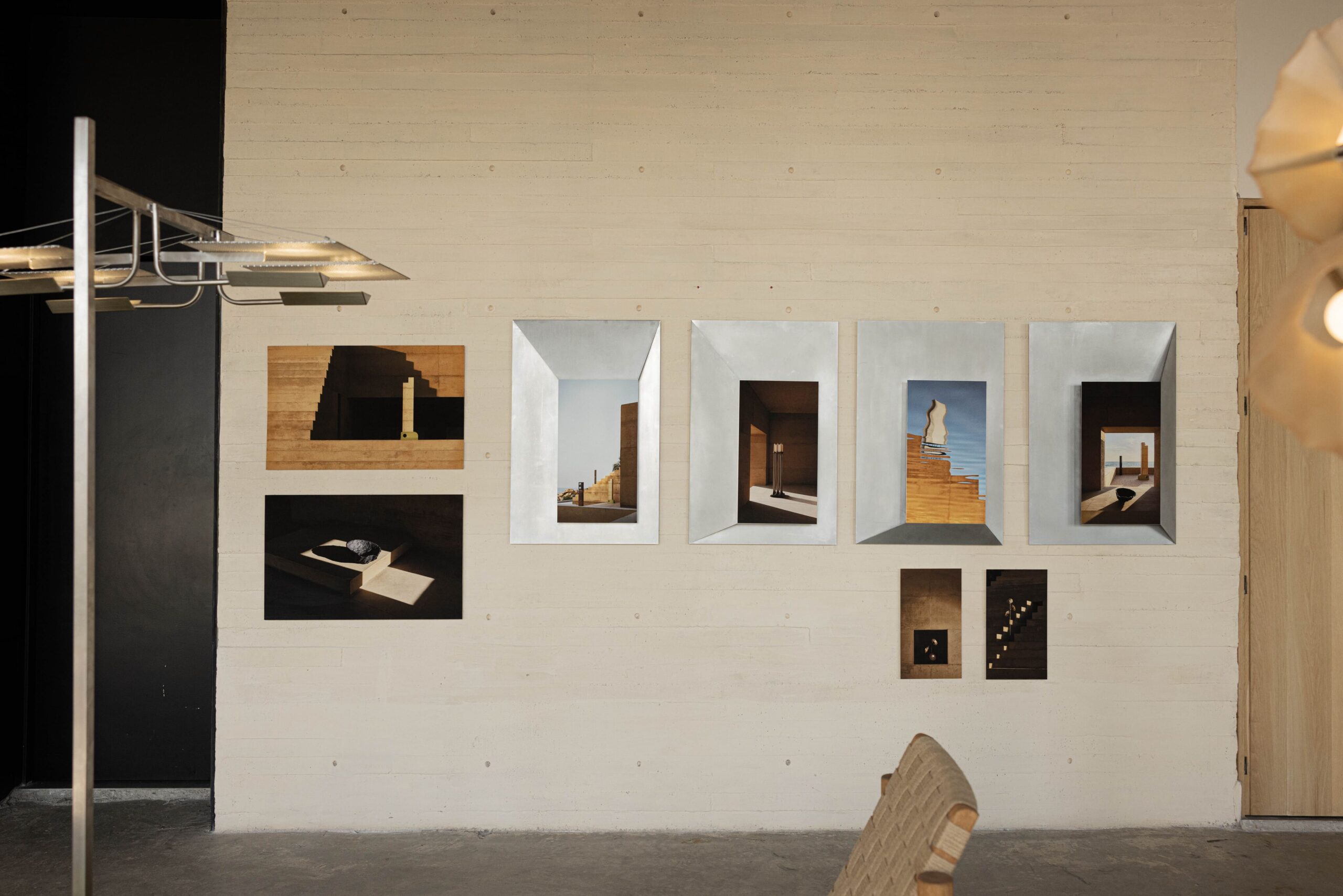 THE PHOTOGRAPHS ARE PRESENTED IN CUSTOM FRAMES DEVELOPED AS A COLLABORATION BETWEEN ALEJANDRO RAMÍREZ OROZCO AND MANU BAÑÓ, AND DESIGNED BY MANU BAÑÓ. MADE FROM FOLDED ALUMINUM SHEET, THESE FRAMES FORM A SPECIAL DESIGN CREATED SPECIFICALLY FOR THE EXHIBITION AND ENGAGE IN DIALOGUE WITH THE FOURTEEN PHYSICAL PIECES PLACED AT THE CENTER OF THE SPACE ON A PLATFORM.