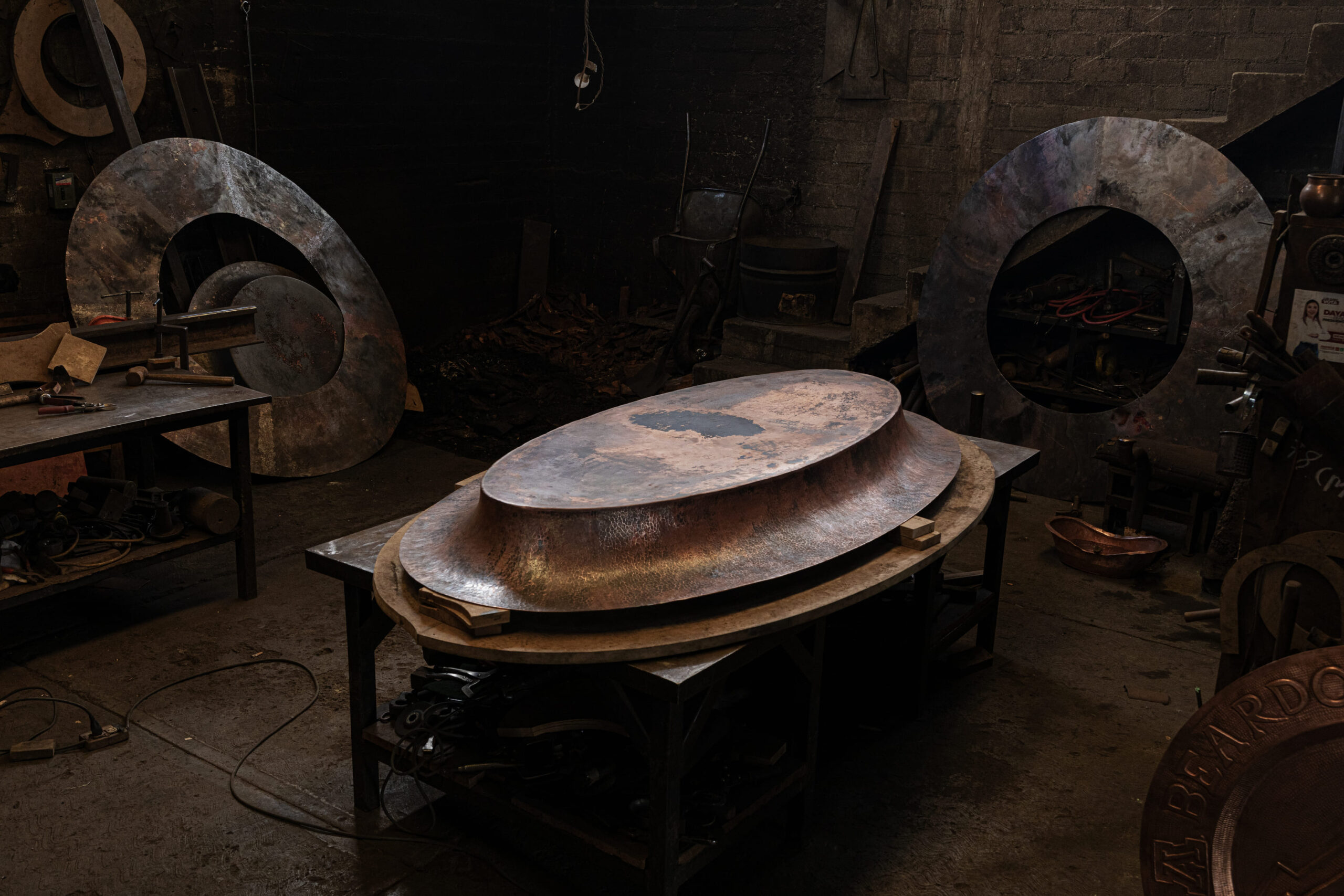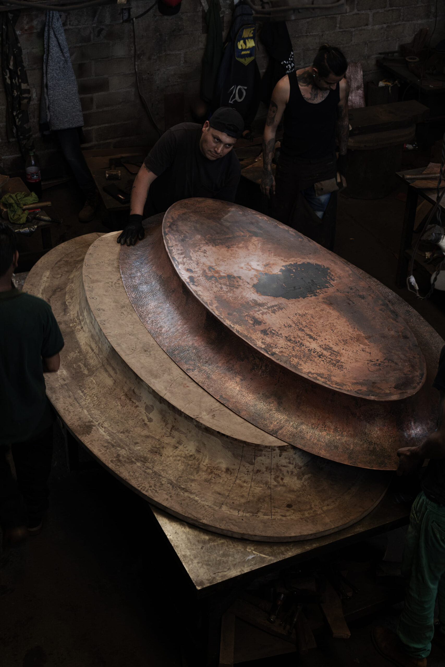 COPPER PIECES ARE HAND-HAMMERED THROUGH A HIGHLY ARTISANAL PROCESS IN WHICH THE MATERIAL IS HEATED IN FIRE TO BECOME MALLEABLE AND THEN SHAPED THROUGH REPETITIVE, PRECISE GESTURES. THE FINAL STAGE TAKES PLACE IN MEXICO CITY, WHERE EACH PIECE IS CAREFULLY REFINED AND FINISHED.