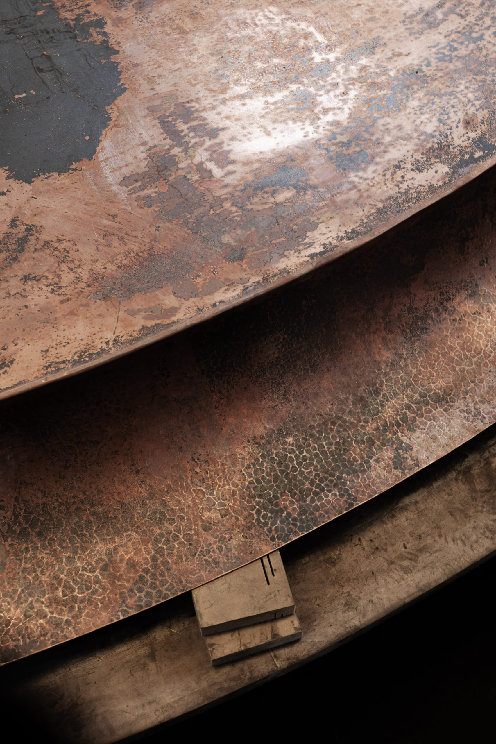 COPPER, TEMPERED BY FIRE, ABANDONS ITS TWO-DIMENSIONAL FORM TO OCCUPY A THREEDIMENSIONAL SPACE THROUGH HUMAN MANIPULATION. IN ITS FINISH, THE MARKS OF THE MATERIAL’S PRODUCTION PROCESS ARE EVIDENT, WITHOUT PATINAS OR POLISH.