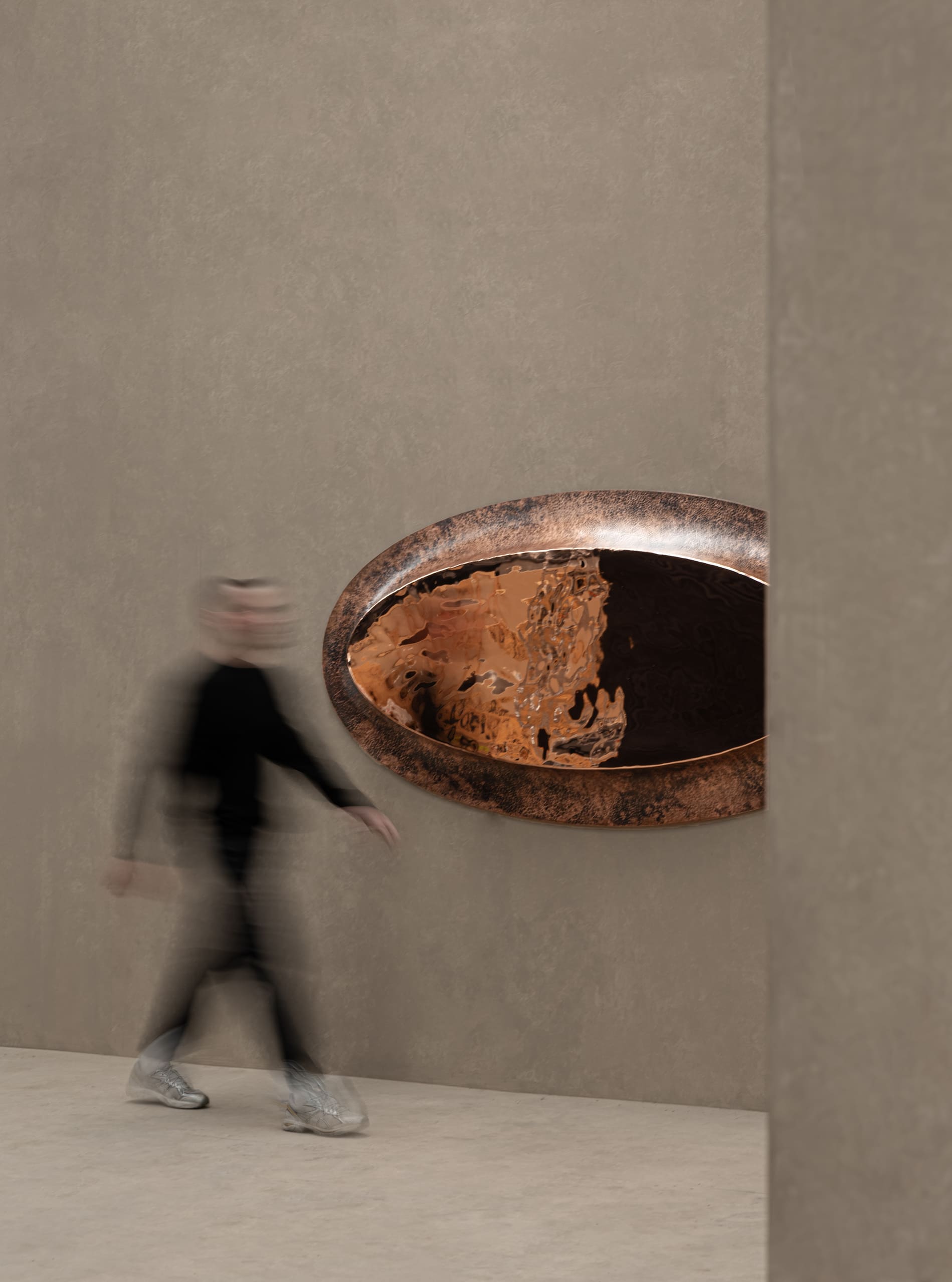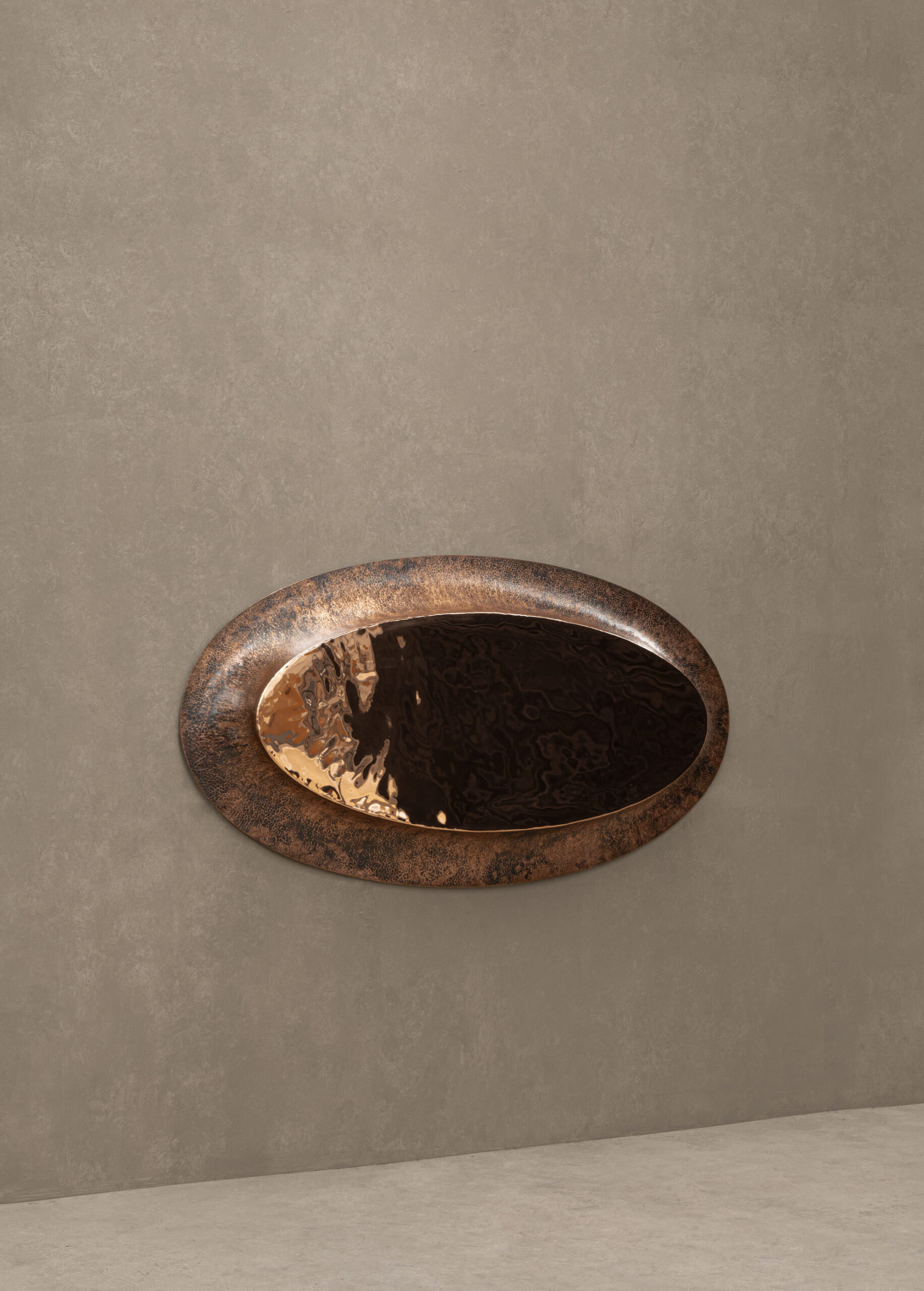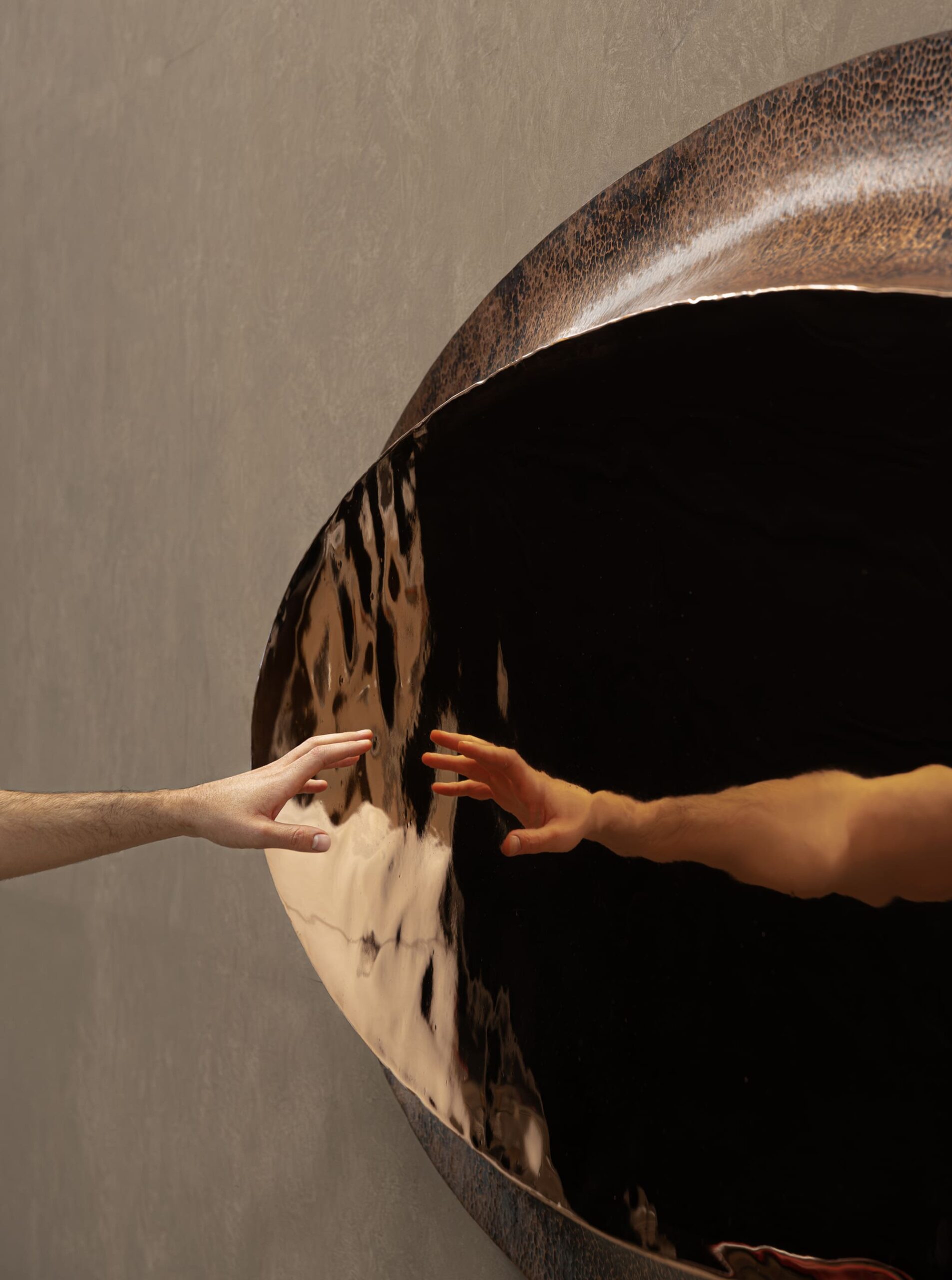 THIS SERIES EXPLORES THE REFLECTIVE PROPERTY OF COPPER, WHICH, WHEN POLISHED, GENERATES A MIRROR SURFACE. WITH THE PURPOSE OF BEING SCULPTURAL PIECES, THEY OCCUPY THE SPACE THAT WOULD NORMALLY BE TAKEN BY A PAINTING ON A WALL. IT CONSISTS OF THE SAME OBJECT DUPLICATED IN SYMMETRY, ONE CONCAVE AND THE OTHER CONVEX, DESIGNED TO BE DISPLAYED TOGETHER AS A SINGLE WORK.